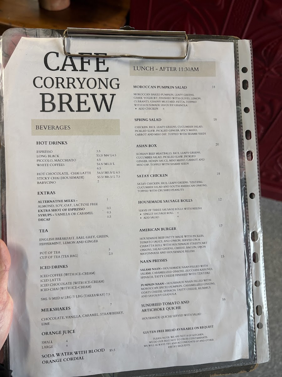 Introducing the menu at Cafe Corryong Brew, a cozy haven located in the heart of Corryong, VIC, where every bite and sip feels like a warm embrace. The cafe boasts an impressive selection of hot drinks, including a perfectly brewed Espresso and silky Cappuccino, both priced at A$3.50, making it a must-visit for coffee enthusiasts. Indulge in their delectable homemade treats, like the rich Chocolate mousse or delightful Scones, often highlighted in rave reviews.